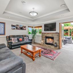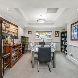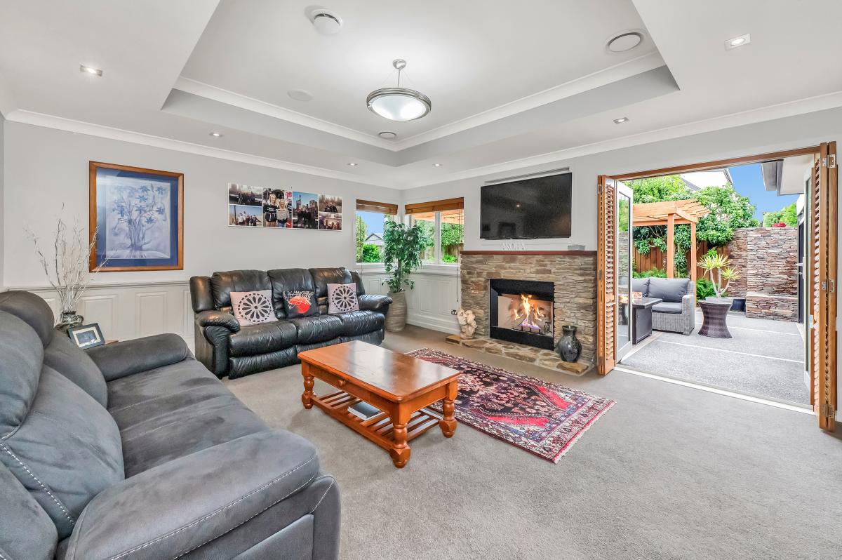 Comfort is key, with double glazing, multi-zone central ducted heating, a gas fire, and an HRV system ensuring a cozy environment in any season. Architectural details such as feature ceilings and wall paneling add a touch of sophistication throughout.