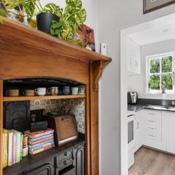 A cosy living room anchors the home, warmed by central heating and filled with natural light. The interlinking kitchen and dining area provide an inviting space for shared meals and relaxed entertaining, with scope to further modernise.