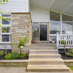 Morning coffee on the front porch, kids racing out to the trampoline, friends around the table on the deck while music drifts out from the living room. The renovated kitchen is crisp and white, with gold accents, and is perfectly aligned with the outdoors, so you're always part of the action.