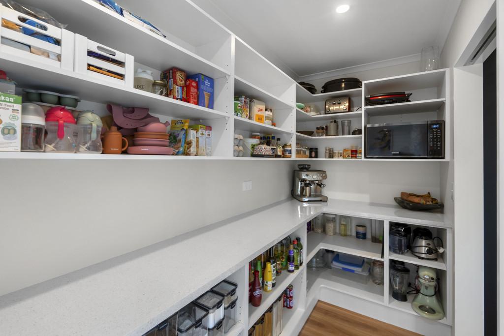 The home features a formal tiled entryway leading into an open-plan living area with architectural scissor trusses that provide a sense of space and height. The kitchen includes engineered stone benchtops, an oversized oven, induction cooktop, double fridge space, strip LED lighting, and a full-length scullery. A built-in office nook with a window is located at the end of the scullery.