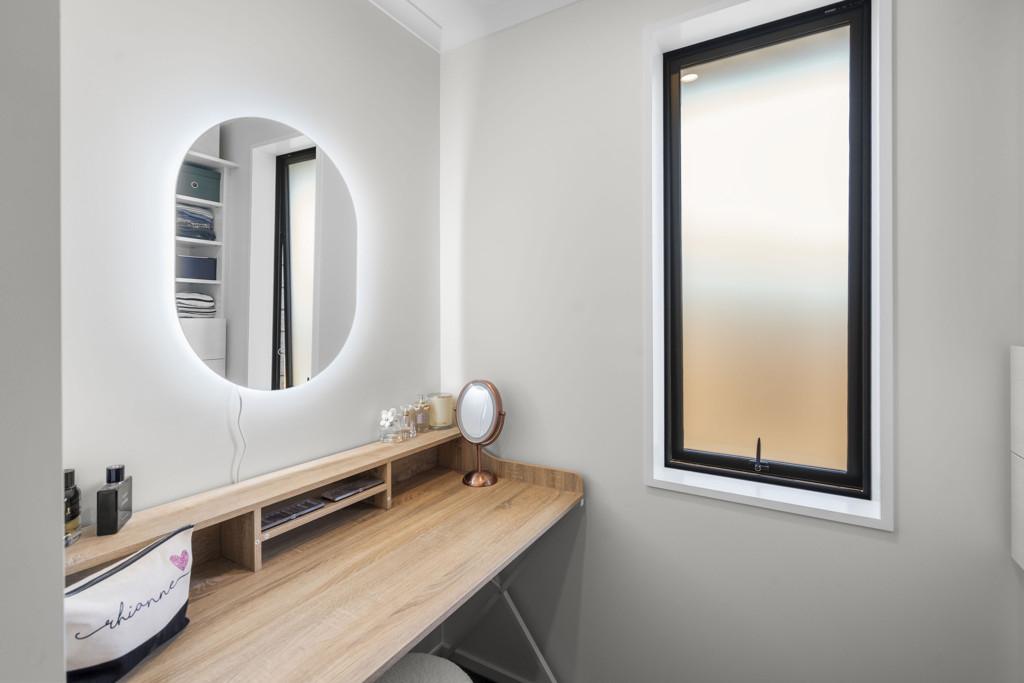 The master bedroom includes an oversized, fully tiled ensuite and a full-length dressing room with a make-up station. Two further bedrooms are serviced by a family bathroom with a separate toilet, super-sized bathtub, and extra-large towel rails.