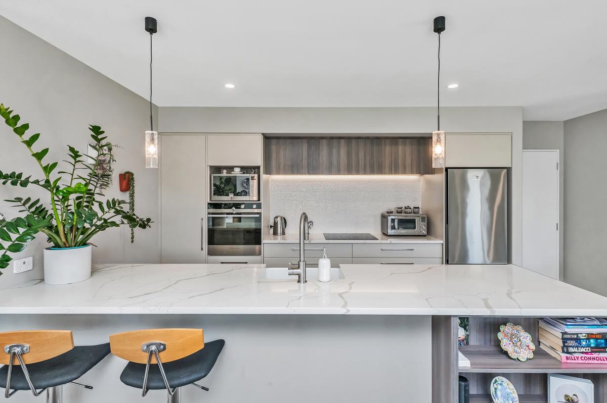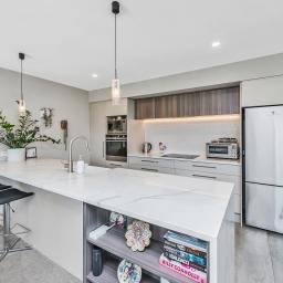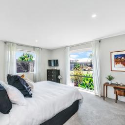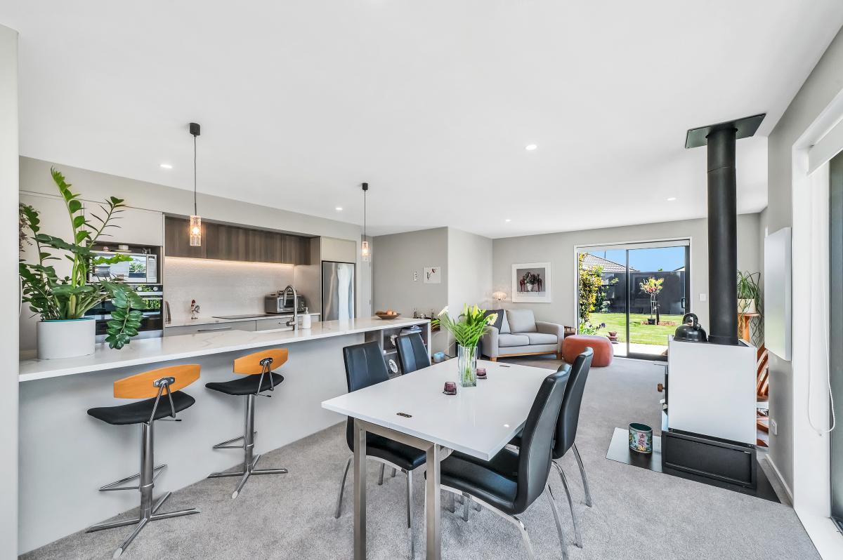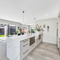 At the heart of the home, the kitchen makes a statement with its beautiful stone benchtops, Italian tiles, double dishwashers, Hafele pantry system and butler sink. This is the perfect spot to cook, connect, and entertain. A modern ULEB pyro fire and a heat pump keep things cosy year-round, while the fully insulated and carpeted double garage adds flexibility for storage or hobbies.