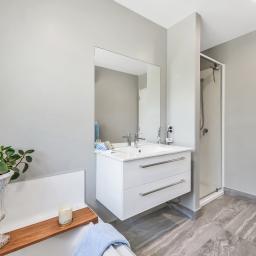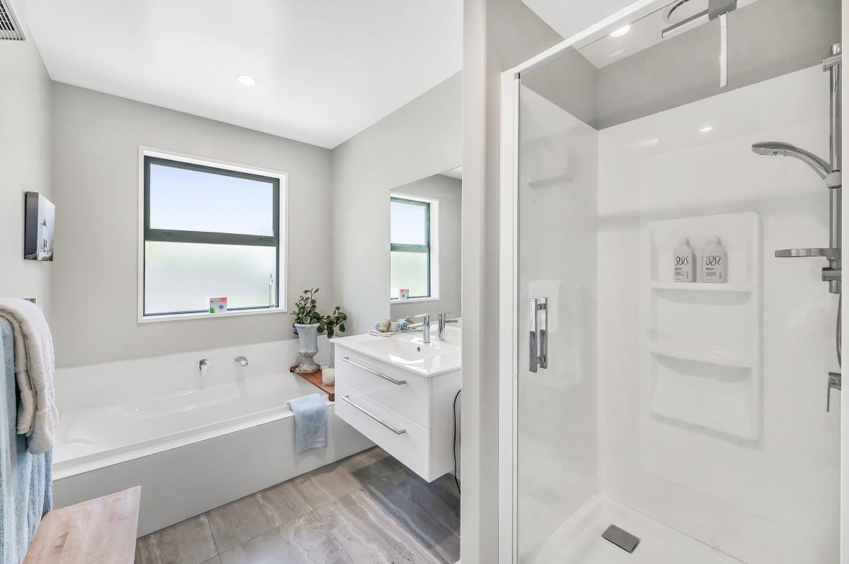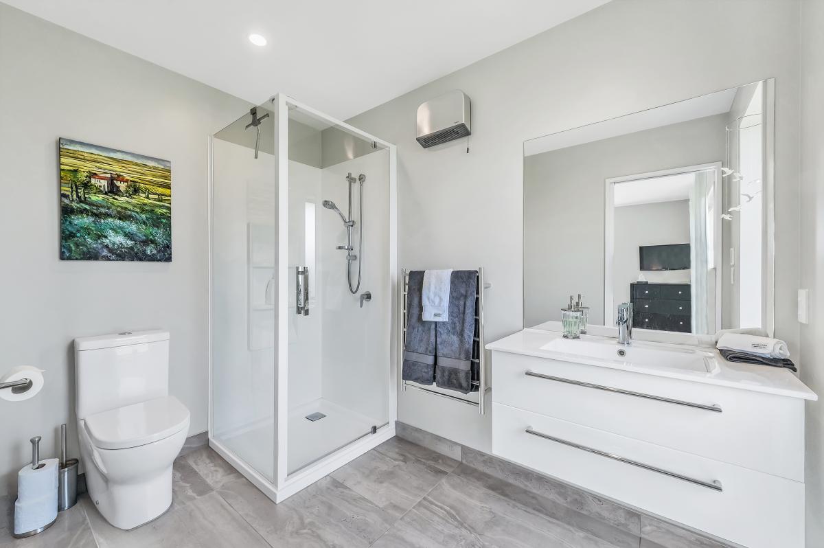 The home offers three spacious bedrooms, including a generous main suite with a walk-in wardrobe and a sleek ensuite. The second bathroom is equally well finished, designed with both practicality and style in mind. Storage is plentiful with a large walk-in linen cupboard.