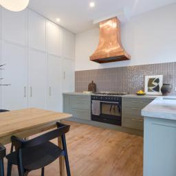 Commanding attention, a show-stopping designer kitchen anchors the living spaces with bold, artistic intent. A striking copper rangehood glows against the warmth of concrete, sleek custom cabinetry and the precision of brass detailing. It's a kitchen that doesn't merely function, it performs. A space where texture, light and craftsmanship converge.