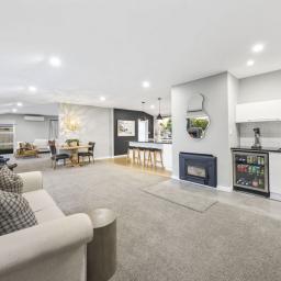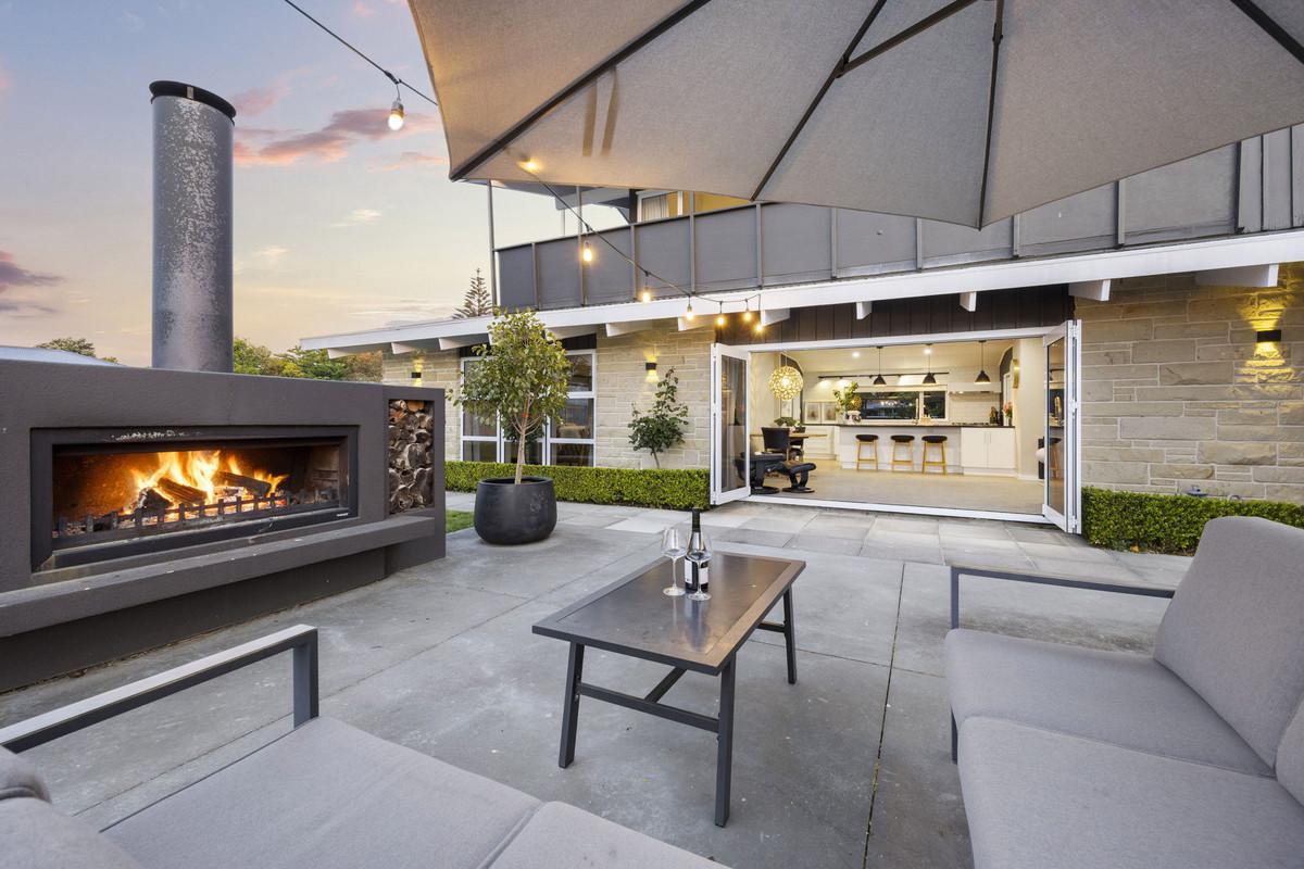 The ground floor delivers generous open-plan living, with the designer kitchen and scullery forming the heart of the home. The adjoining dining and family areas include a stylish built-in bar, perfect for entertaining, and flow seamlessly through stacker doors to a large outdoor patio complete with fireplace for year-round enjoyment. A separate lounge provides additional living space, while a guest bedroom, full bathroom, separate toilet, and dedicated laundry add practicality and comfort.