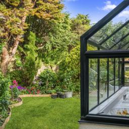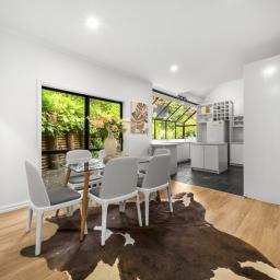 Filled with natural light, the open-plan living, dining and kitchen areas feel warm and inviting. The home is surrounded by trees, flowers and lush greenery, and the garden includes various plants and fruit trees, a lovely setting for buyers who enjoy gardening or simply love being close to nature.