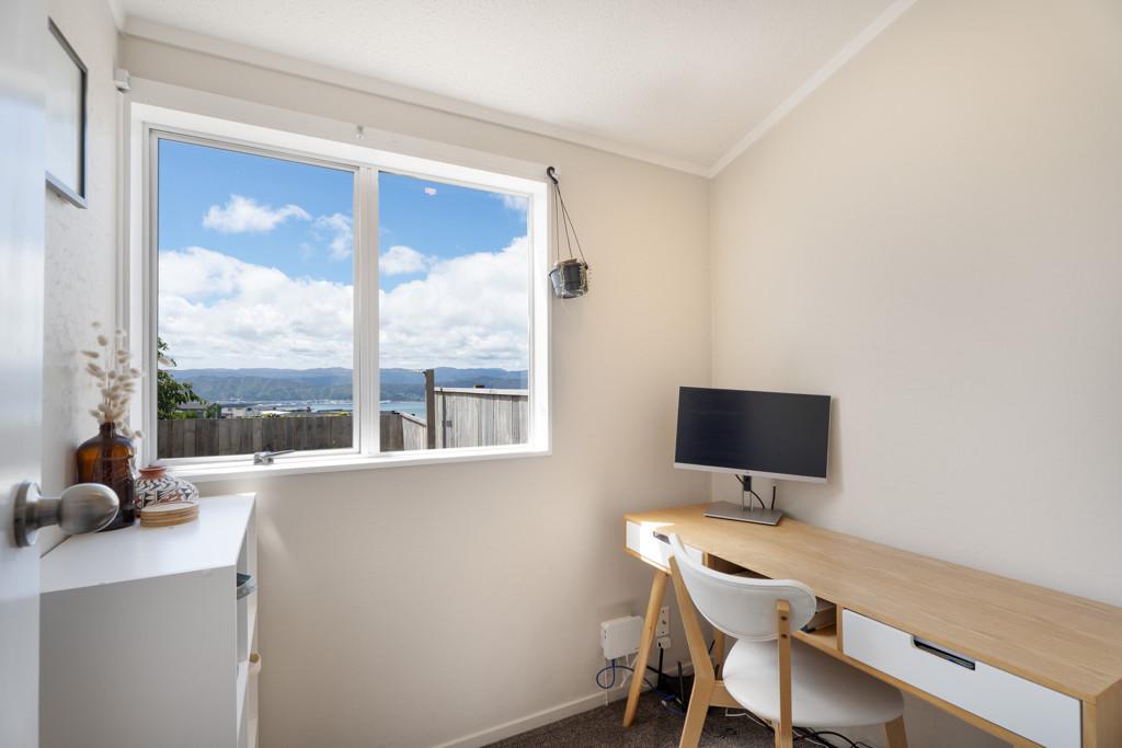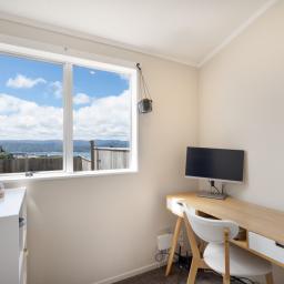 The layout features your living space and kitchen downstairs, as well as an office and second toilet just off the laundry, perfect for those who work from home or like to entertain. As you head upstairs, you'll find two spacious double bedrooms and the bathroom, with a gorgeous outlook towards the harbour and the Hutt Valley on the eastern side of the property. Your sunny home will also be kept warm and dry with a heat pump. Outside, you'll find a low-maintenance section and vege garden beside the single garage which is perfect for added storage or parking.