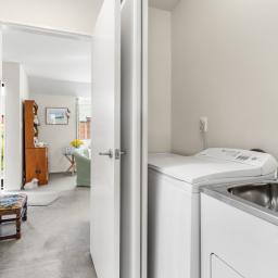 The well-sized bedroom is a peaceful retreat, opening directly to the private back garden - a charming spot to enjoy your morning coffee, unwind with a book, or tend to a few pots, flowers, or a small vege patch. The outdoor area also includes a garden shed for extra storage and a washing line neatly positioned for convenience. Inside, a well-appointed bathroom features a skylight that floods the room with natural light, enhancing the sense of space and comfort, while a discreetly integrated hallway laundry ensures everything has its place. With ample storage throughout, the home is exceptionally practical without compromising comfort.