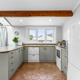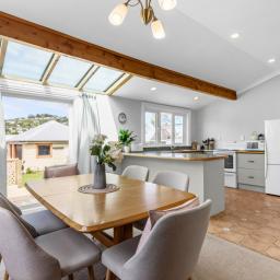 The open-plan kitchen, living and dining form the warm heart of the home, light-filled, inviting and ideal for both everyday life and relaxed entertaining. When the sun is shining, throw open the French doors and enjoy effortless indoor-outdoor flow to a generous, sun-drenched deck and flat, family-friendly lawn.