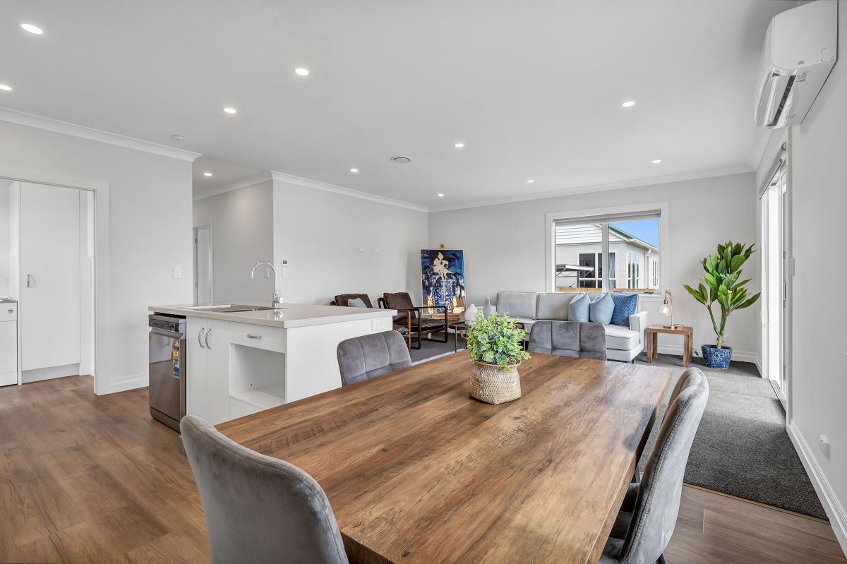 The kitchen forms the heart of the space, offering a centre island with a breakfast bar, gas cooking, modern white tiles and cabinetry, and thoughtful storage that keeps the area balanced and tidy. Laminate flooring in the kitchen and dining zones adds warmth and durability, while downlights create an even glow throughout the home. The lounge flows through a sliding door to the outdoors, letting in summer breezes and adding flexibility for gatherings.