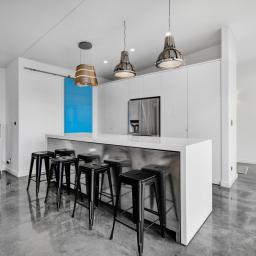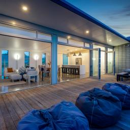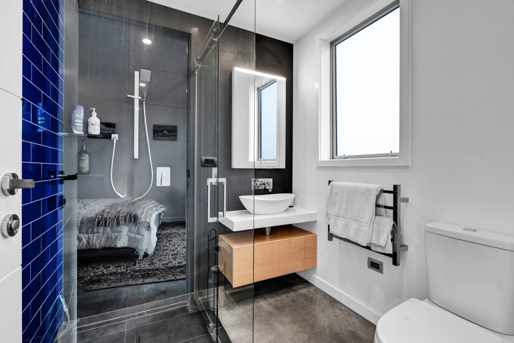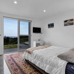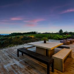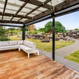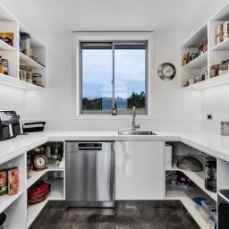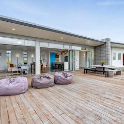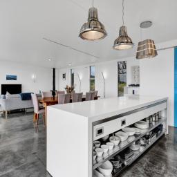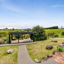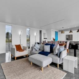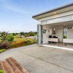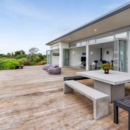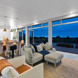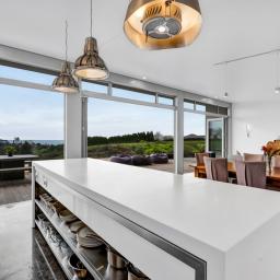 Architecturally designed in 2016, the home captures all-day sun and showcases sweeping rural-to-sea views. Every living space flows seamlessly outdoors, creating a relaxed sense of openness. The stunning kitchen, dining, and lounge area opens to a generous deck-perfect for entertaining friends, family barbecues, or simply unwinding at sunset with a glass of wine. The designer kitchen delights with clever features, including a retractable benchtop concealing the cooktop and sink, while a spacious scullery keeps the mess out of sight when guests arrive.