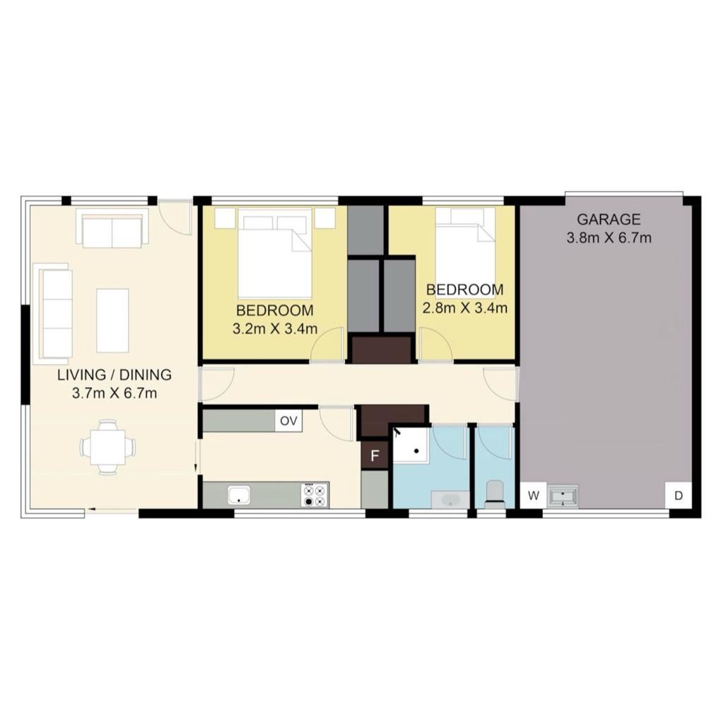 Accommodation includes two double bedrooms, each with built-in wardrobes, a large bathroom, and a separate toilet. The internal single garage features the laundry and additional storage.
