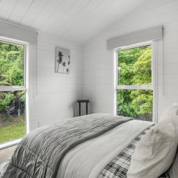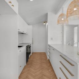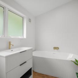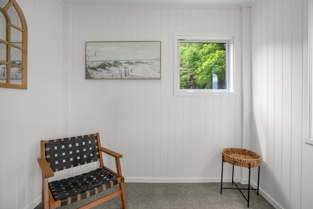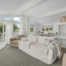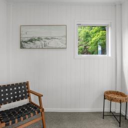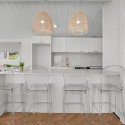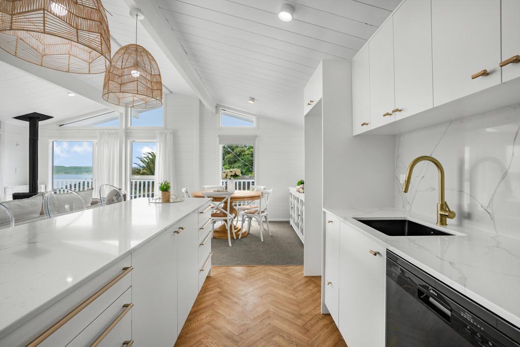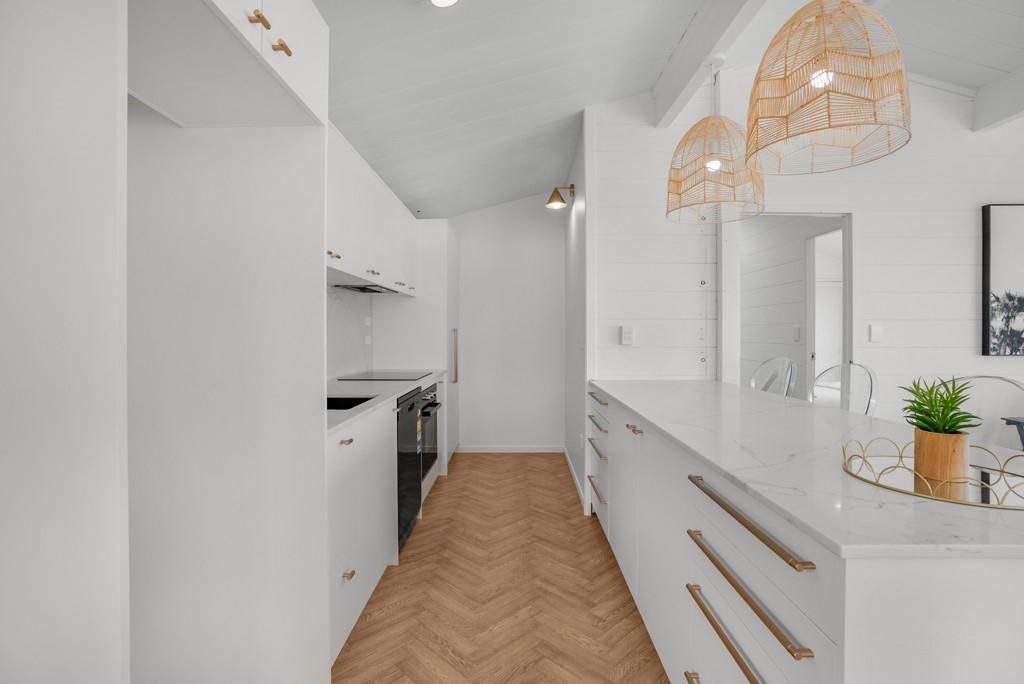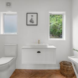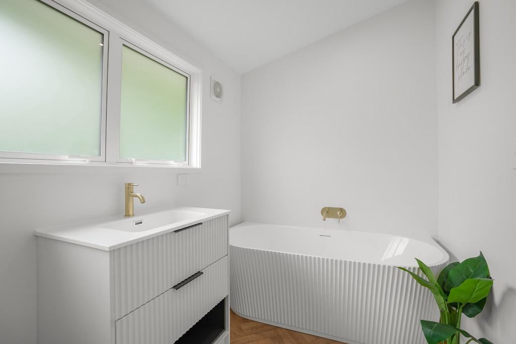 This home has been fully double-glazed and has undergone a like-for-like re-clad, along with the obvious areas, including interior lining, a new kitchen, and bathrooms. Thoughtful design details elevate the space, including herringbone-style flooring in the kitchen, bathrooms, and laundry, brushed brass fixtures, a ribbed bathtub, elegant lighting, marble benchtops, and sheer curtains and blinds throughout.