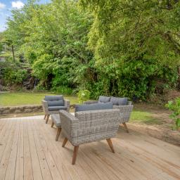 The first floor features three double bedrooms with built-in wardrobes, serviced by a family bathroom with a standalone shower, bath, vanity, and toilet. The heart of the home is the open-plan living area, with a sleek kitchen showcasing a marble breakfast bar and brand-new appliances, including a dishwasher, electric cooktop, and oven. Flow seamlessly from the kitchen to the dining and living areas, warmed by a wood burner, and step through sliding stacker doors onto the wrap-around deck to soak in the breathtaking high-living views.