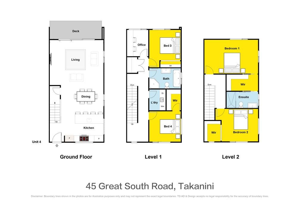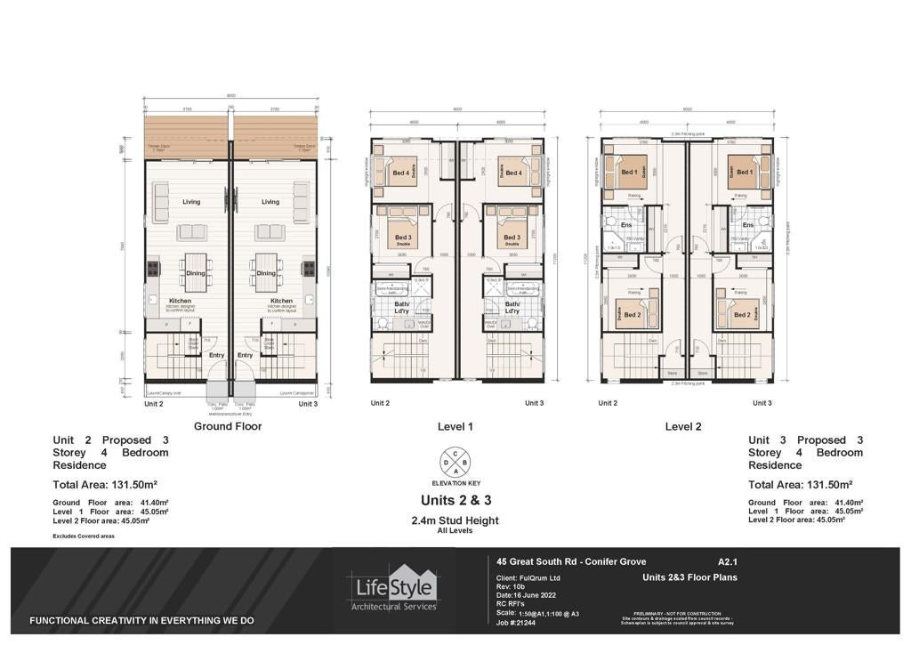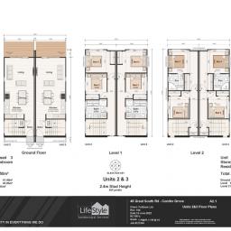 • Lot 4: Three-level home with 4 bedrooms, 2 bathrooms, laundry, and a study/small bedroom.