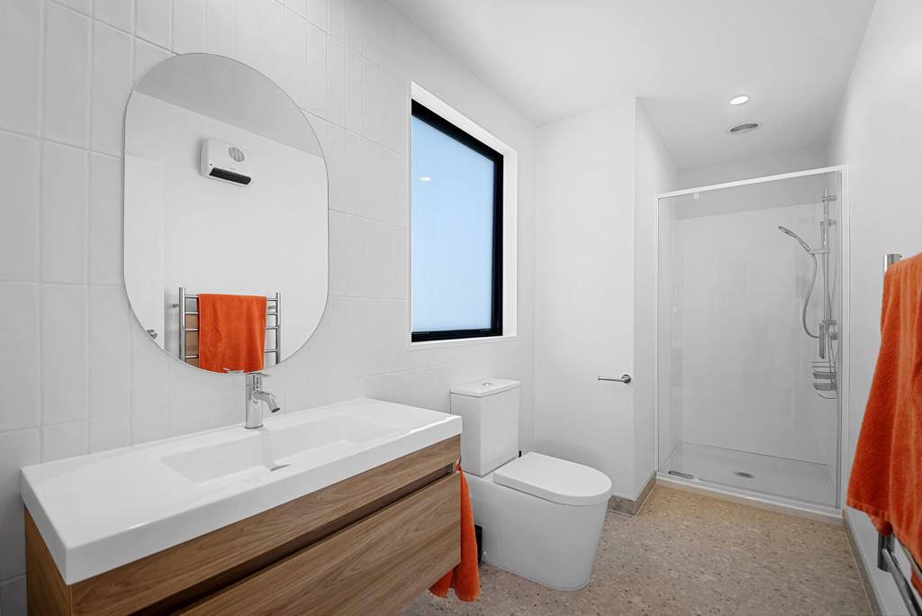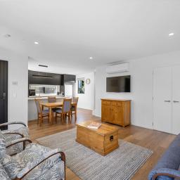 Upstairs, two well-proportioned bedrooms are complemented by two stylish bathrooms, including a master ensuite. Comfort is ensured year-round with a heat pump, and the convenience continues with an allocated off-street car park right at your doorstep.