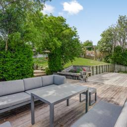 The lovely backyard is a paradise for kids and pets, surrounded by beautiful, established gardens that add peace, privacy, and charm.