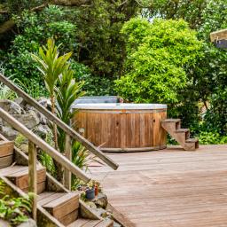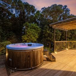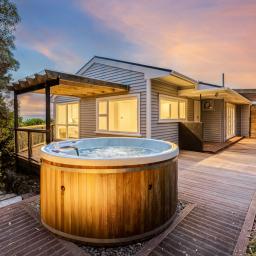 • Three double bedrooms with built-in wardrobes, including a master bedroom with direct deck access and a hot tub for unwinding under the stars