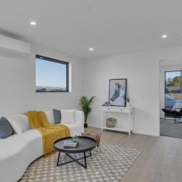 Step inside to a light-filled open-plan kitchen, dining, and living area, ideal for everyday living and entertaining. The designer kitchen features gas cooking, engineered stone benchtop, a walk-in pantry, large linen cupboard storage, and premium Fisher & Paykel appliances, complete with a plumbed double fridge space. A separate lounge offers the perfect spot to relax or enjoy movie night.