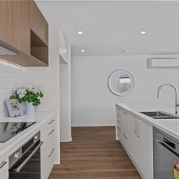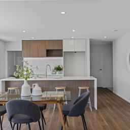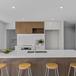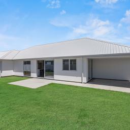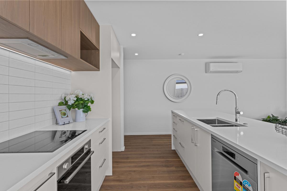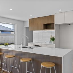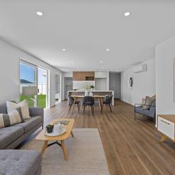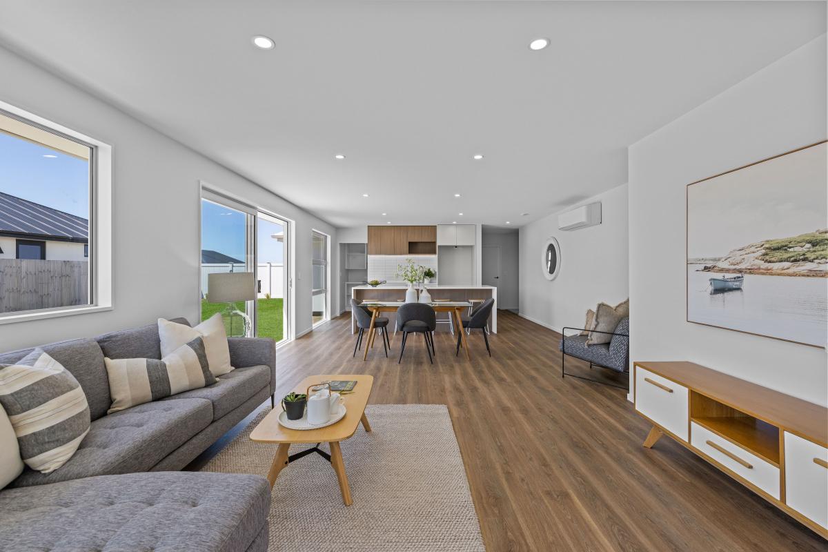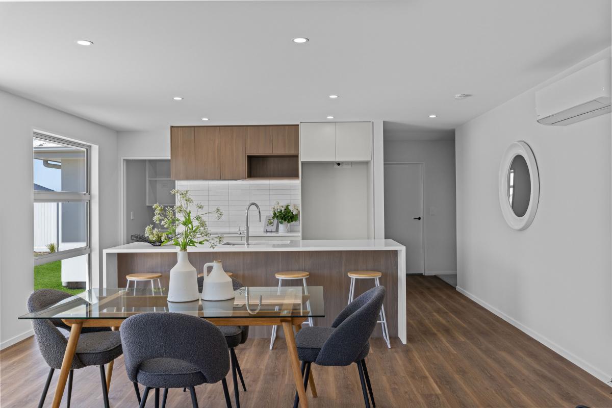 The home then opens into a striking kitchen, dining and living area, finished with hard-wearing tiled flooring and warmed throughout by a centrally located heat pump. The kitchen is a standout, featuring 30mm stone benchtops, including in the walk-in pantry, a centre island with waterfall edges, a double fridge cavity and quality appliances, including an induction cooktop. Dual sliding doors open to two concrete patios, one of which is a covered alfresco area, seamlessly extending your living spaces outdoors.
