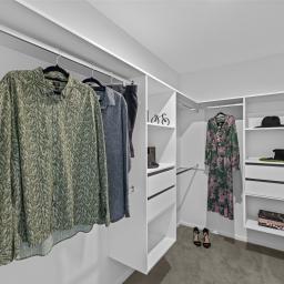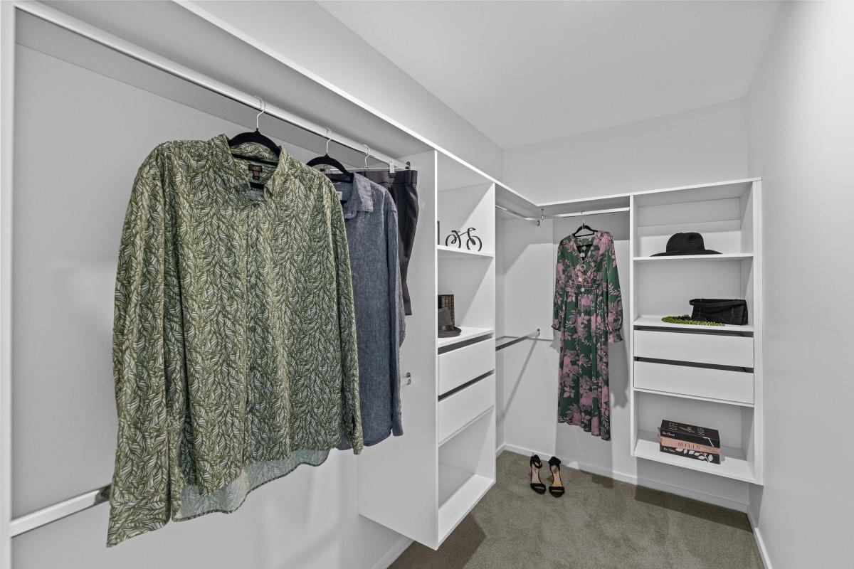 Step inside and the wide hallway sets the tone, leading to a separate lounge and the first of the large double bedrooms, each with custom-built wardrobes, shelving and drawers.