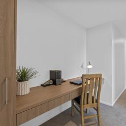 A second hallway leads to a well-appointed separate laundry with ample storage, the remaining double bedrooms, and the master suite with its expansive walk-in wardrobe and tiled ensuite. The family bathroom has full tiling, a standalone bath, a separate toilet, and LED lighting in both bathrooms. A thoughtfully placed study nook, complete with a built-in desk, drawers, and shelving, rounds out this intelligently designed home.