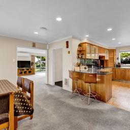 Two separate lounge areas provide flexibility for families to spread out, each opening to a large, private paved patio on the western side of the home, perfect for enjoying long afternoons and evening gatherings. Both lounges include log fires for cosy winter comfort, with an additional heat pump in one for year-round climate control.