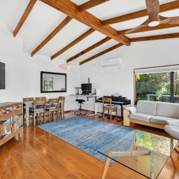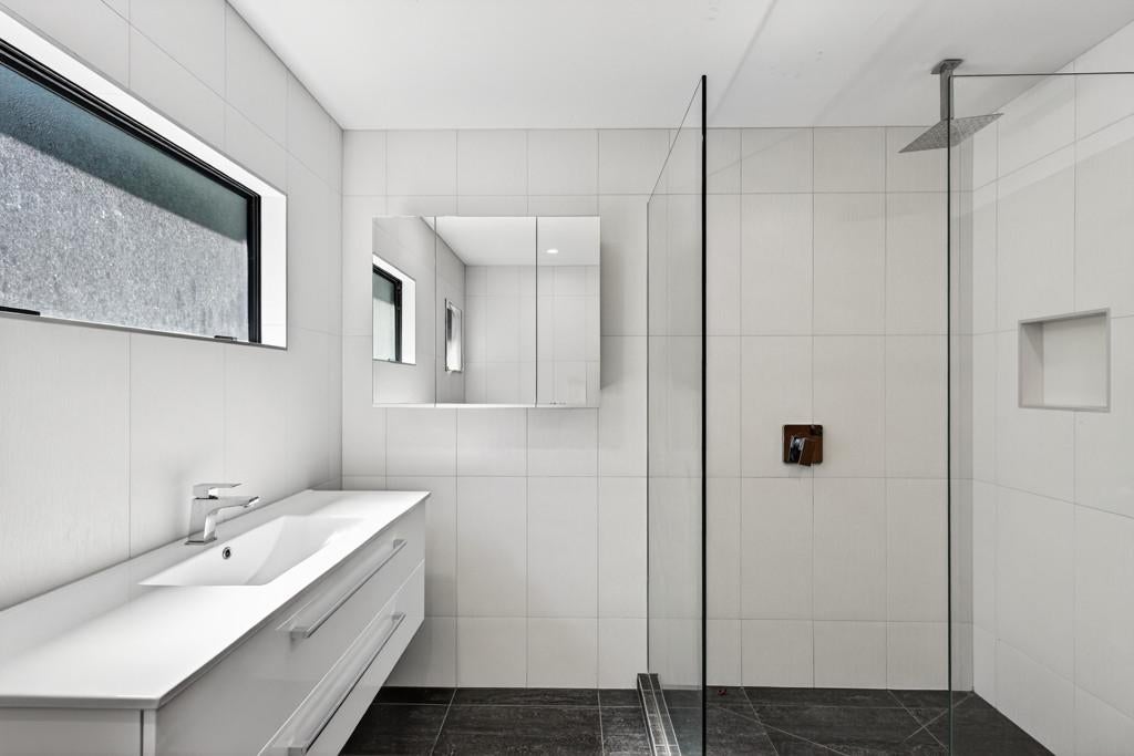 The master suite features an ensuite, walk-in wardrobe, and direct deck access, capturing stunning views and abundant natural light. Two modern tiled bathrooms offer both style and everyday practicality, while the sleek kitchen and air conditioning ensure effortless living. A large single garage with integrated laundry and a partially fenced section complete the home, providing convenience, comfort, and the ideal setting for relaxed Bluff Hill living.