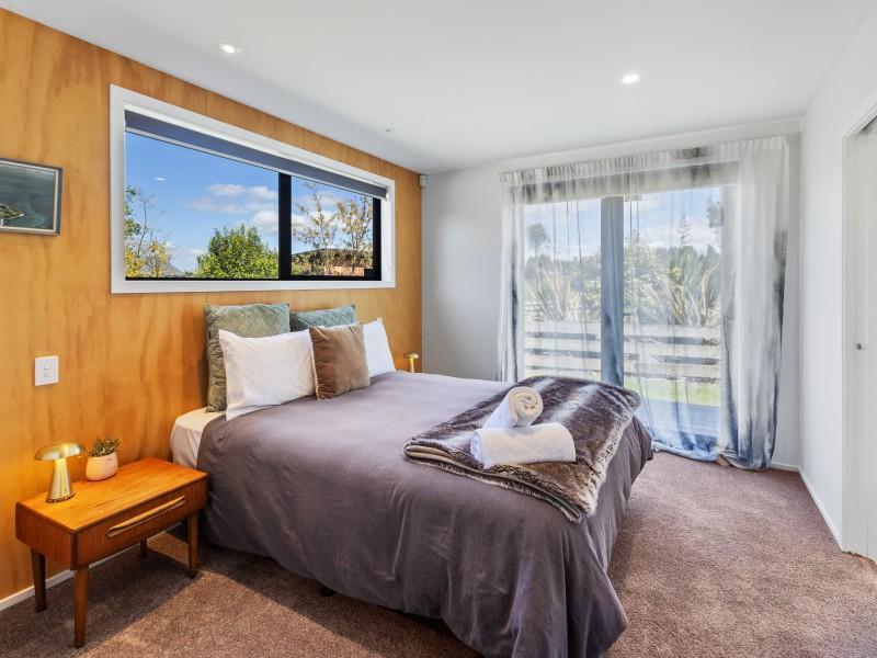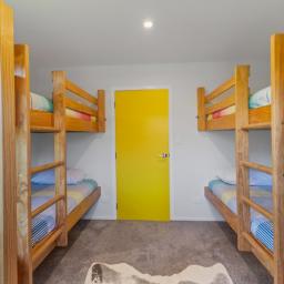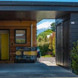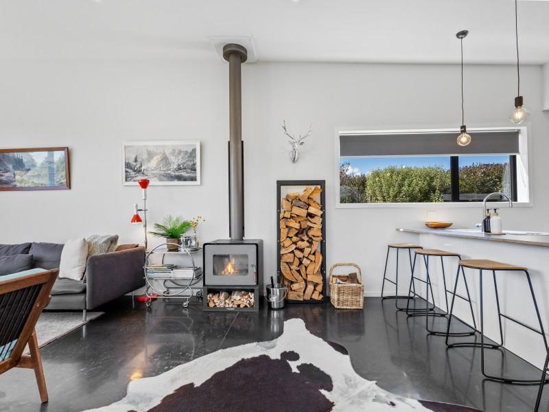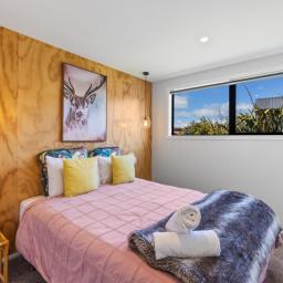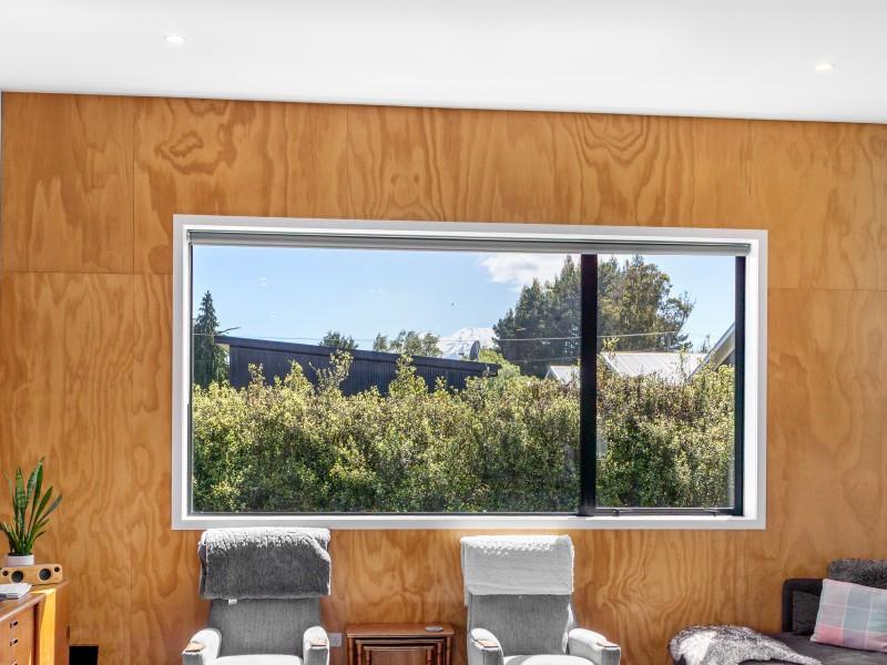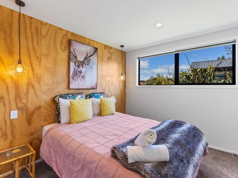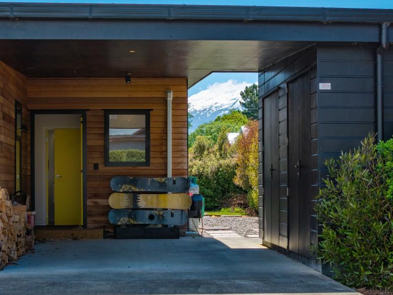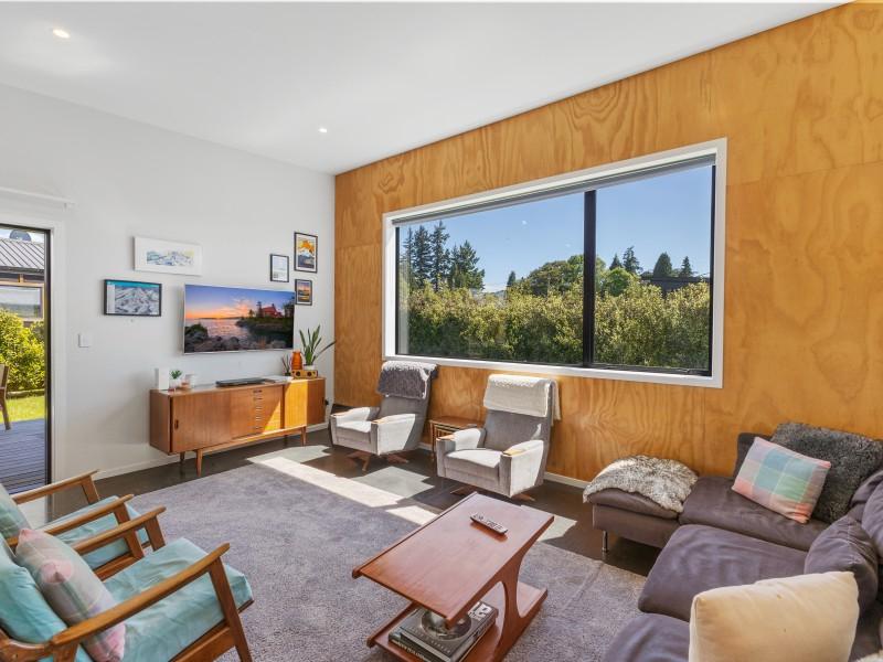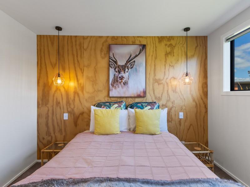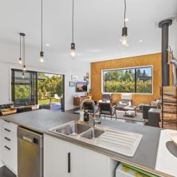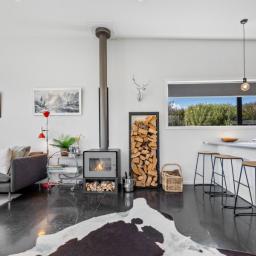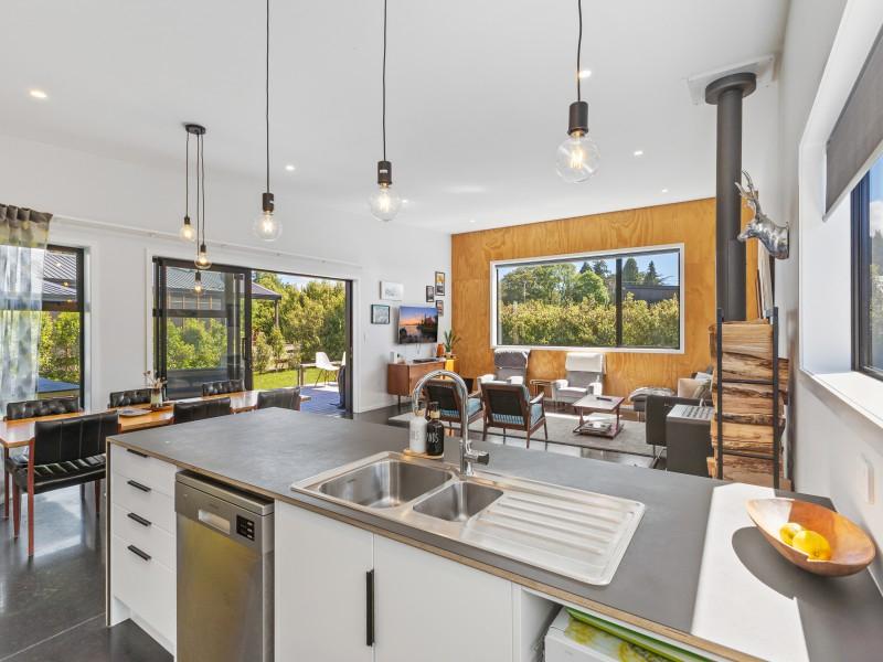 At the other end of the house is a large, light and spacious open plan living area with windows and bifold doors allowing loads of natural light to spill in to this gorgeous space. It also leads on to a large sunny deck giving great indoor-outdoor flow and a super spot to entertain and enjoy the beautiful fresh mountain air and starry skies above Ohakune. There are mountain views from both inside and outside with the window in the living area framing the mountain. And this home is heated by a wood burner and also a heat pump in the hallway. Throughout are feature particle board walls, yellow doors and very tasteful lighting.