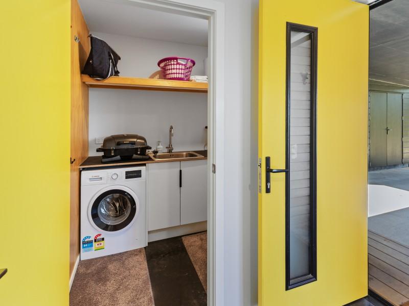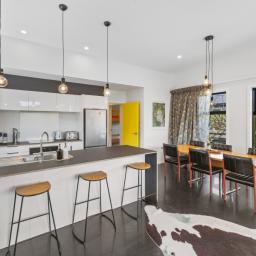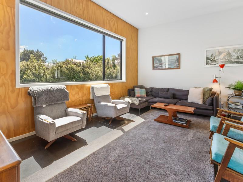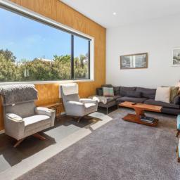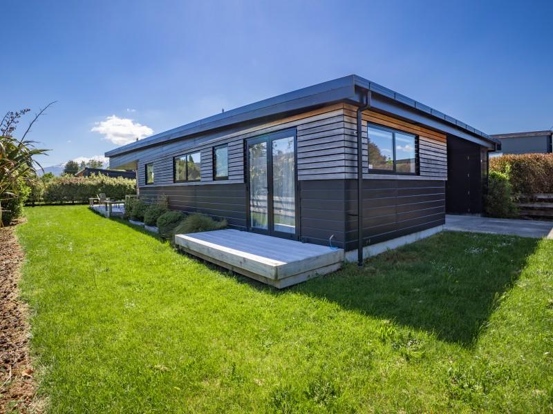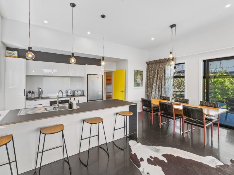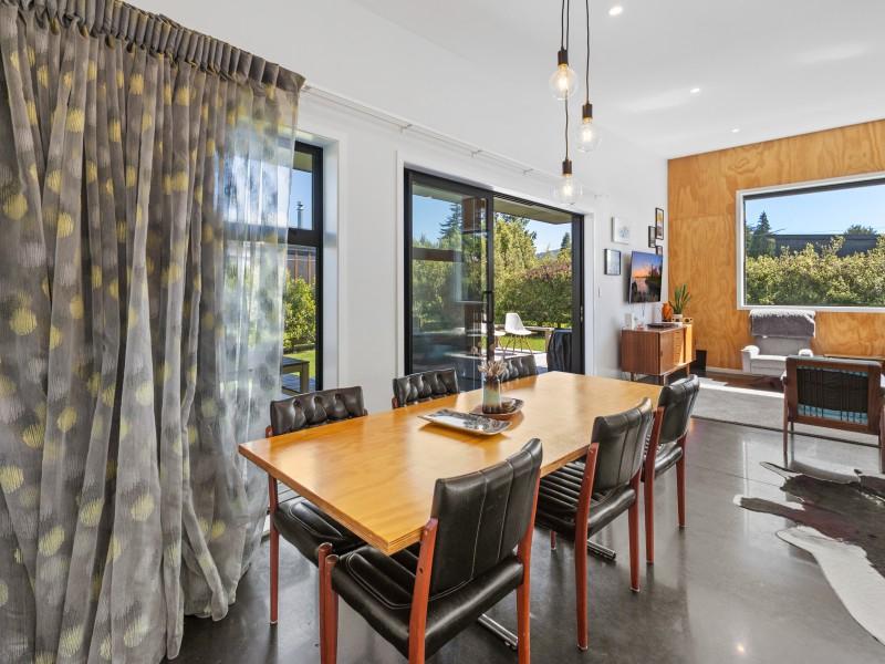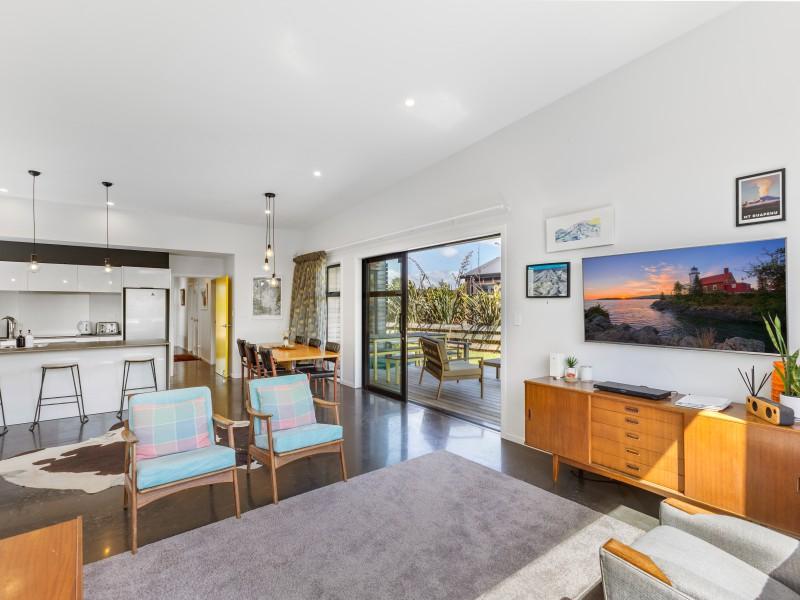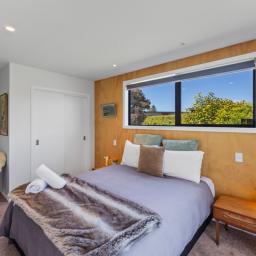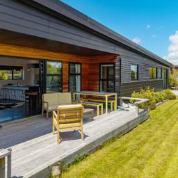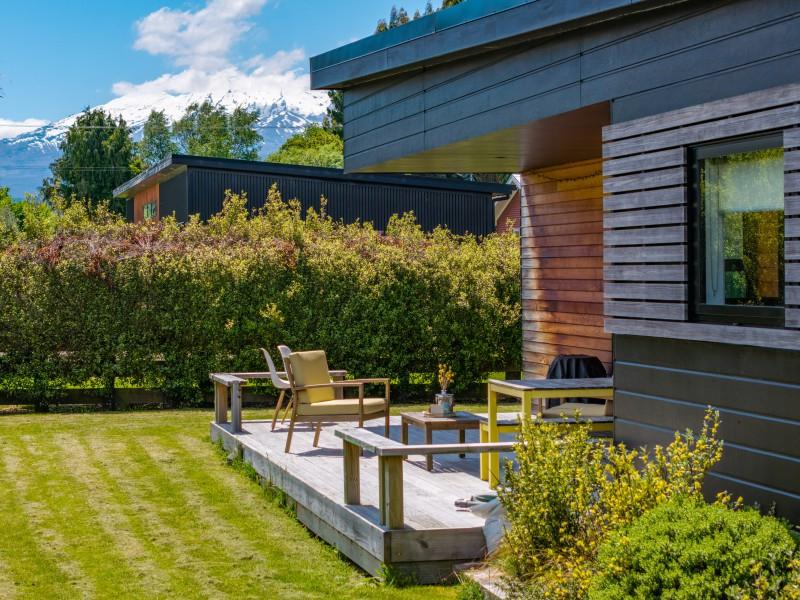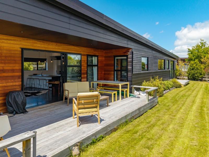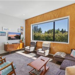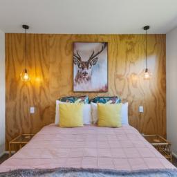 At the other end of the house is a large, light and spacious open plan living area with windows and bifold doors allowing loads of natural light to spill in to this gorgeous space. It also leads on to a large sunny deck giving great indoor-outdoor flow and a super spot to entertain and enjoy the beautiful fresh mountain air and starry skies above Ohakune. There are mountain views from both inside and outside with the window in the living area framing the mountain. And this home is heated by a wood burner and also a heat pump in the hallway. Throughout are feature particle board walls, yellow doors and very tasteful lighting.