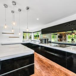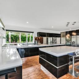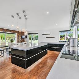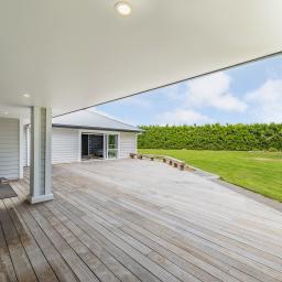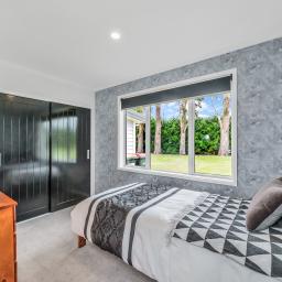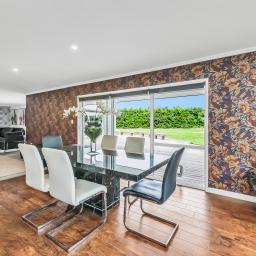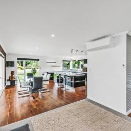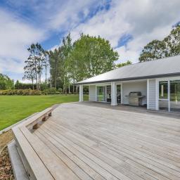The heart of the home is an inviting open-plan kitchen, dining and living space—light-filled, social, and anchored by a kitchen built for those who take food and function seriously. Expansive bench space, quality appliances and seamless connection to the dining area make it a natural gathering point. The living zone stretches out toward the outdoors, where large sliders open to generous decking. Private, mature gardens frame the space, creating a backdrop that feels a world away despite being minutes from town.