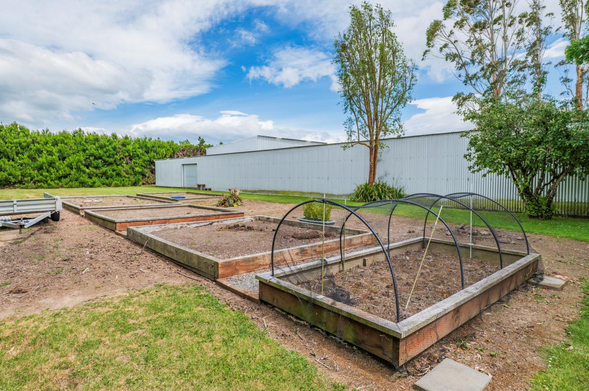 Outside, the irrigated lawn frames the home, while productive vegetable beds, three well-fenced paddocks and a two-bay animal shelter take care of the self-sufficiency boxes. Storage and workspace are exceptional: a two-bay shed with power and a separate storeroom for the important bits, and a six-bay shed (also powered) with two enclosed bays—ideal for machinery, hobbies, toys, or a mix of all three.