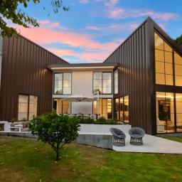 Set privately from the street with electric gate entry, the home opens to sheltered outdoor living, generous lawns, and established fruit trees, all framed by the peaceful native bush, a serene sanctuary that combines calm, privacy, and architectural sophistication.