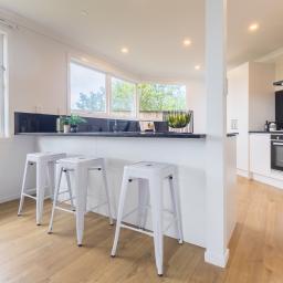 Set on a rectangular site with intelligently managed contours, the home rises above its lower-level garage and rumpus spaces to deliver bright, elevated family living. The modern kitchen anchors the home with ample space to entertain and come together for family living. The lounge is open and inviting, with large windows and a slider to a sunny patio.
