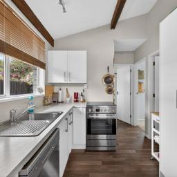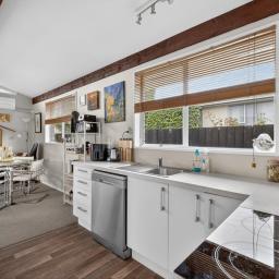 Nestled at the rear and beautifully positioned to capture the sun, this north-facing home sits just a stone's throw from the beach-approximately 100 metres from the sand. Inside, two double bedrooms accompany a modern kitchen and a light-filled living and dining area, enhanced by high ceilings and exposed wooden beams for a warm coastal vibe. A tidy bathroom, heat pump, and single garage with internal access add everyday comfort, while the fully fenced, private backyard offers an ideal spot to relax or enjoy outdoor living. A delightful coastal cutie in an unbeatable seaside location.