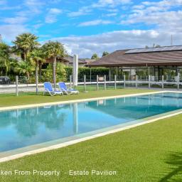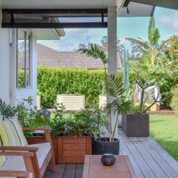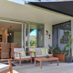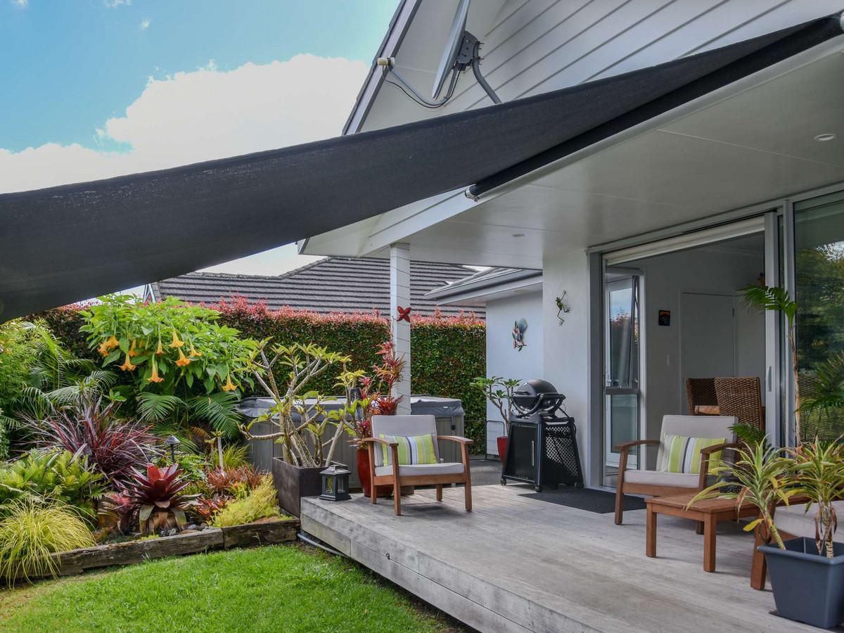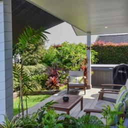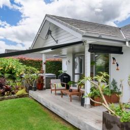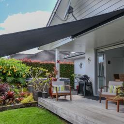 • Covered outdoor deck, complete with retractable shade sail and side panel. A concrete pad adjacent, currently housing a spa pool.