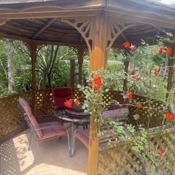 Pockets of fenced and colourful gardens surround the home itself, a gazebo to while away the afternoons surrounded by the scents of the garden, birds visiting the pond, and butterflies delighting in the seasonal blooms.