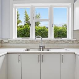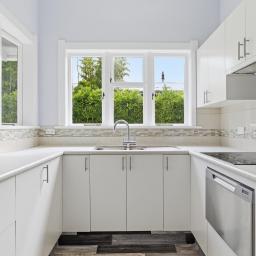 At the heart of the home is the open-plan kitchen and dining area—an inviting space where everyday life unfolds with ease. The modern kitchen, with its clean lines and thoughtful layout, provides an inspiring place for culinary creativity. To the rear of the space is a delightful sitting area, with french doors opening onto the rear deck.
