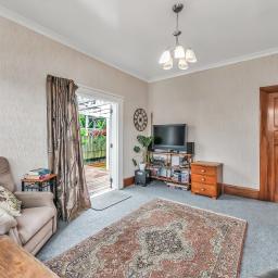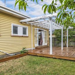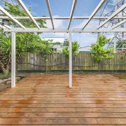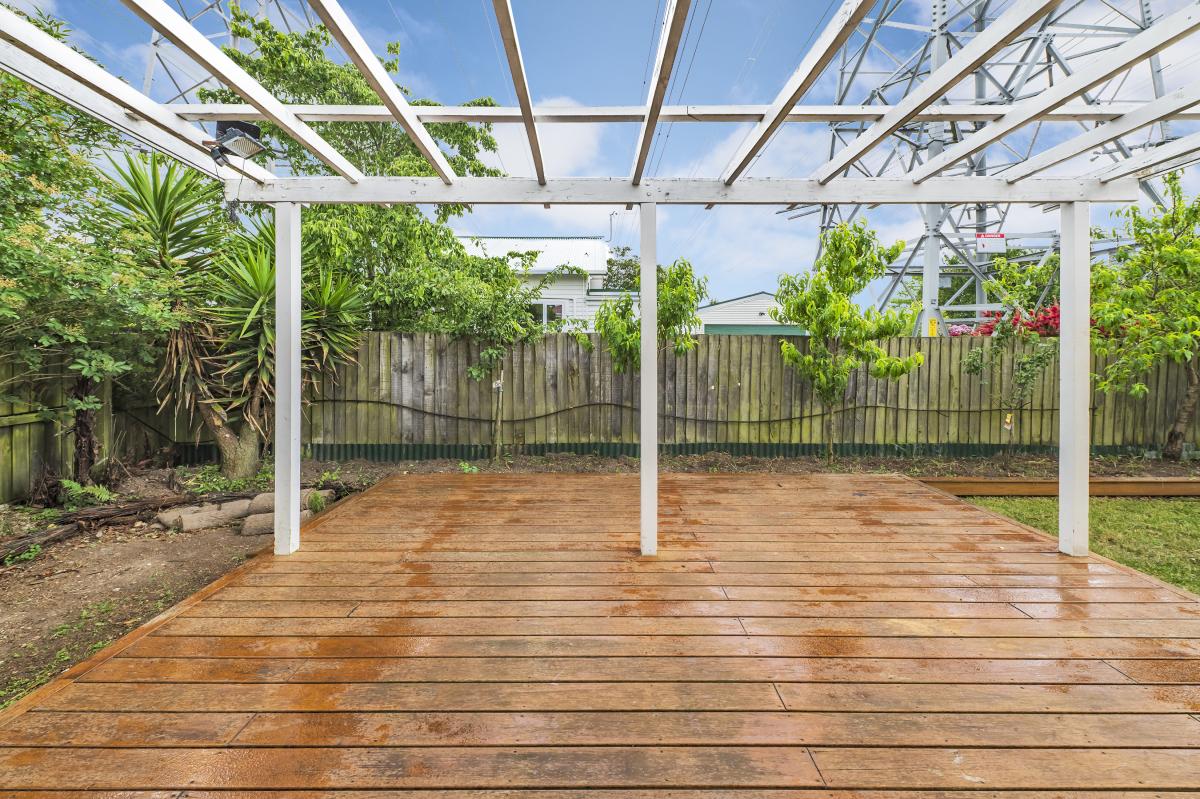 The family bathroom and separate toilet provide convenience for busy households, while the kitchen awaits your personal touch to transform it into a culinary haven. The spacious living room is the heart of the home, offering ample space for relaxation and entertainment. French doors lead to a delightful deck with a pergola, creating a seamless indoor-outdoor flow for summer barbecues and alfresco dining.