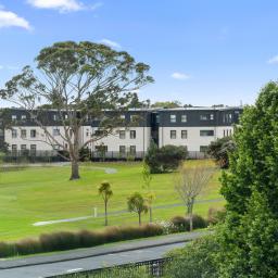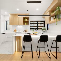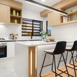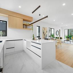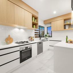 The modern kitchen features clean white surfaces, black linear detailing, high-quality fixtures, gas cooking, and warm timber cabinetry that adds sophistication.