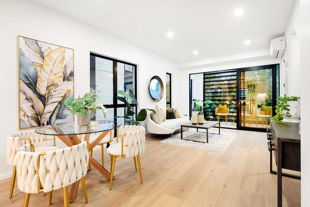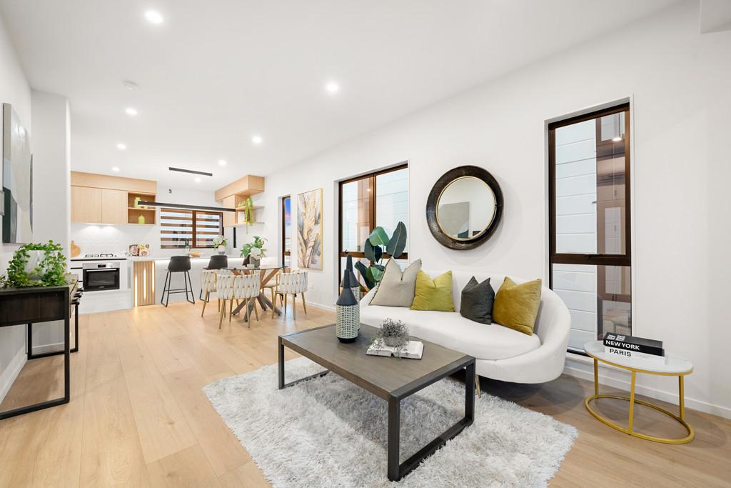 A bright, open-plan living level with wide oak-toned flooring, designer lighting, and effortless indoor-outdoor flow.
