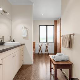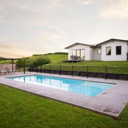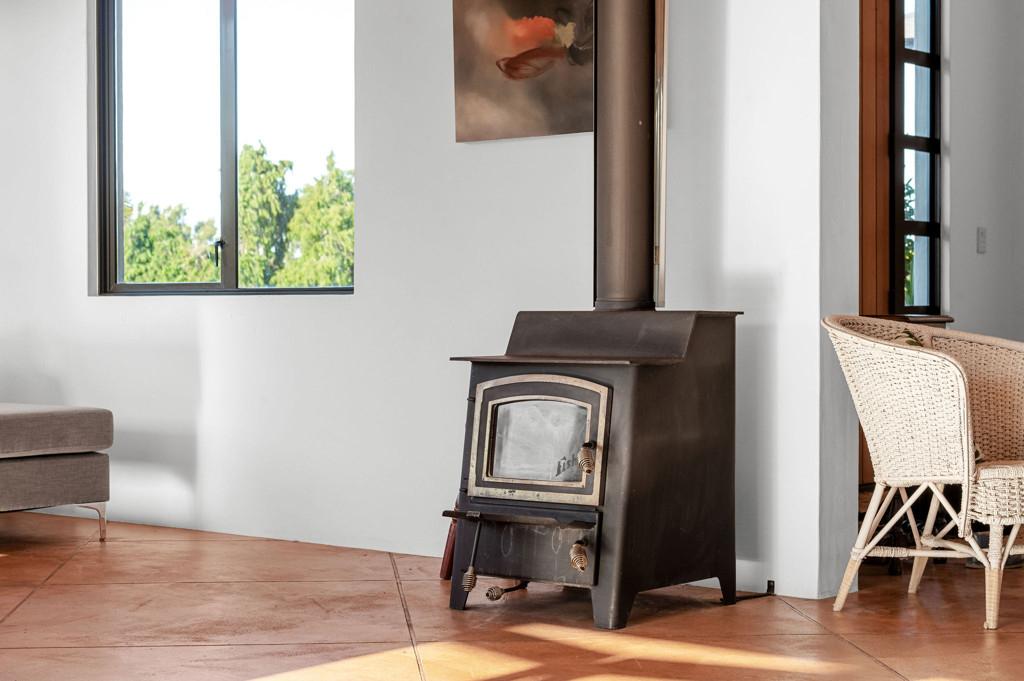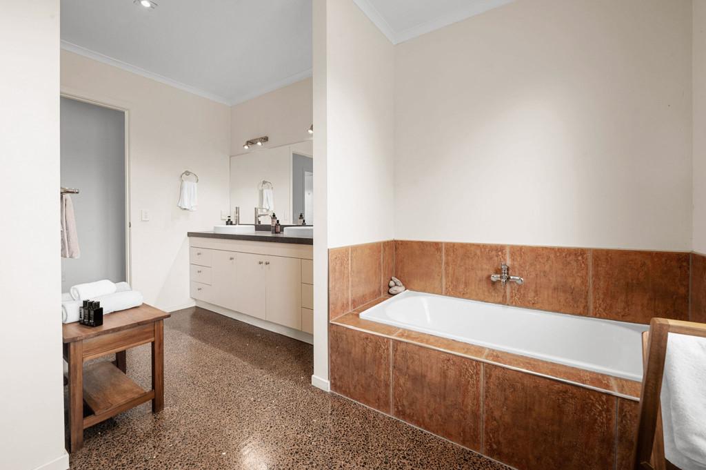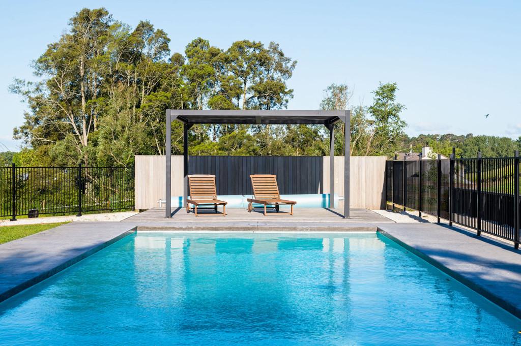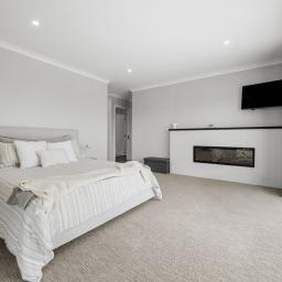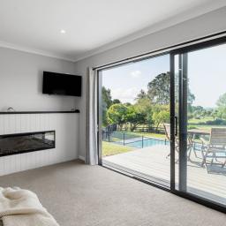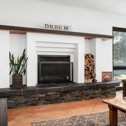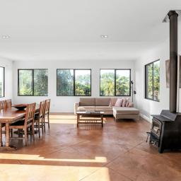 Inside, scale and light define the experience. A 2.7m stud throughout and striking raked ceilings in the main living zones create uplifting volume and calm. Stamped concrete floors bring texture and presence, while three fireplaces ensure warmth and atmosphere through the cooler months.