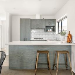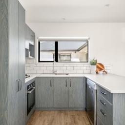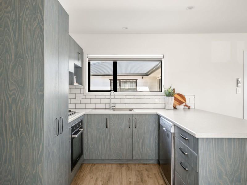 Inside, the open-plan kitchen, dining, and living zone feels bright and welcoming, with contemporary finishes that balance practicality and style. The kitchen features sleek cabinetry, subway tiles, quality appliances, and generous storage — everything you need for everyday ease.