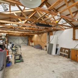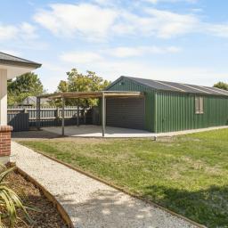 Complementing the family home is a spacious four-car garage and workshop, complete with a pull-down door and a single exit door at the workshop end. This opens to a generous grassy area leading to a garden shed and veggie patch, boosted by additional seasonal growing in the greenhouse. Beautifully barked gardens, established plants, and crisp white-stone paths tie this area back into the main leisure spaces.