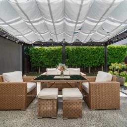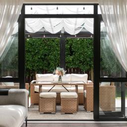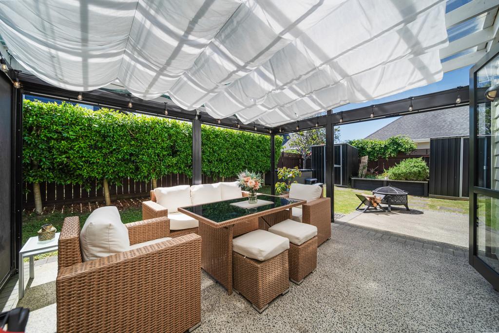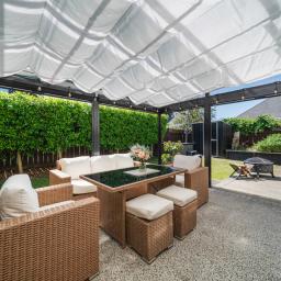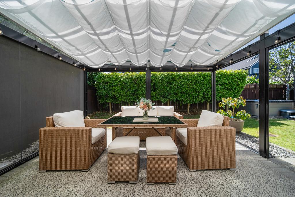 Stepping outside, the beautifully landscaped grounds extend your living space with two stunning pergolas draped in dreamy white canopy, creating elegant outdoor sanctuaries perfect for relaxing, dining, or hosting family and friends. A private spa pool completes this outdoor haven, offering a luxurious space to unwind and enjoy year-round.