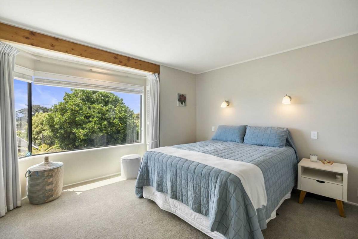 The hub of the home is the cosy lounge and dining with high-pitched ceilings, adding a sense of spaciousness that flows out to a sunny entertainment deck offering sea views to the Takapuna Harbour and Rangitoto. The spacious kitchen, master bedroom, newly designed bathroom and a spacious home office also occupy this level.