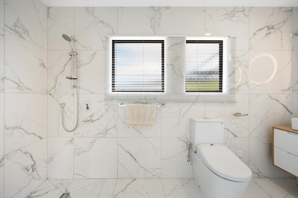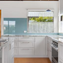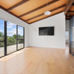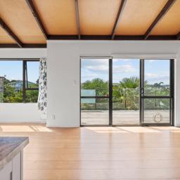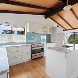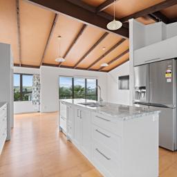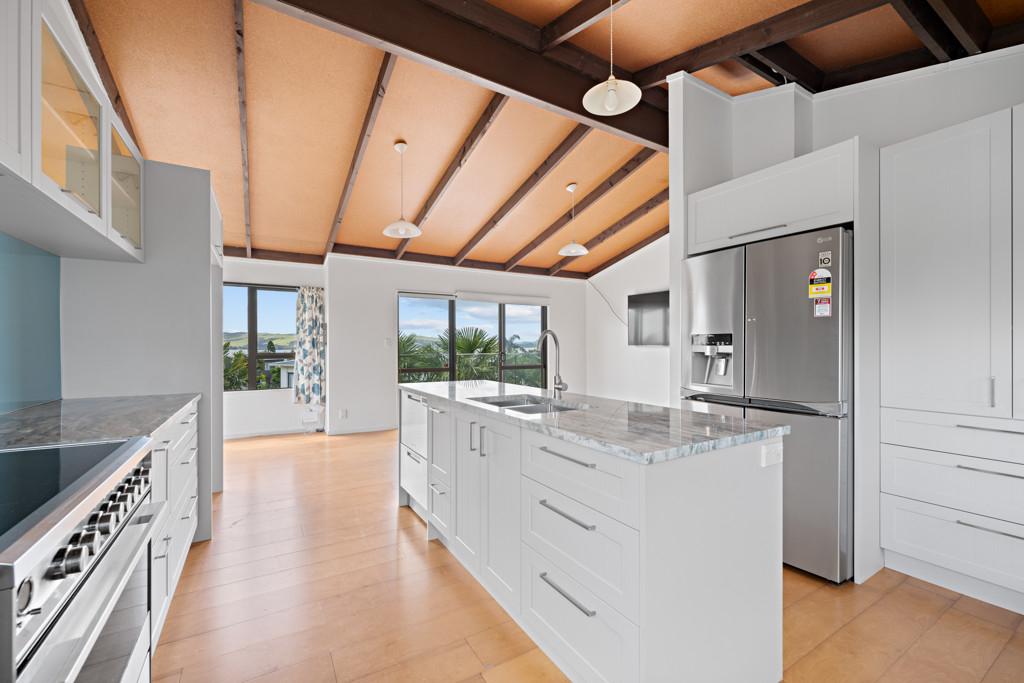 Follow the staircase to the upper floor of this elevated home to step into the brand new entertainers kitchen with granite counter tops, fully fitted with top quality Fisher & Paykel appliances that will remain with the property. The open plan outlook into the lounge and glass surround deck is a magnificent view out to sea and the horizon.