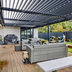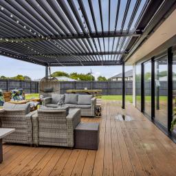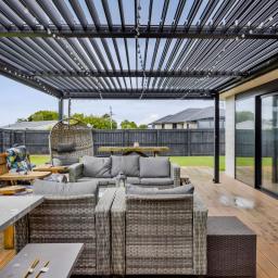At the heart of the home, open-plan living and dining is enhanced by a second lounge, creating versatile spaces suited to both relaxed family living and effortless entertaining. Expansive stacker doors open seamlessly onto a large, covered deck complete with a louvre system, providing an inviting outdoor retreat for year-round enjoyment.