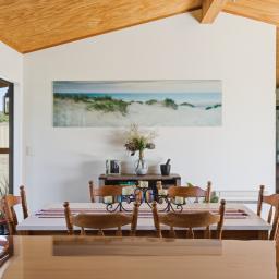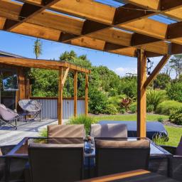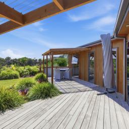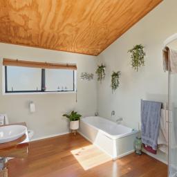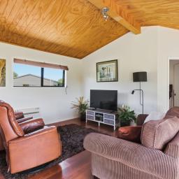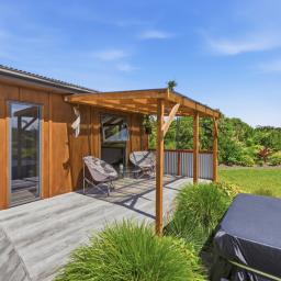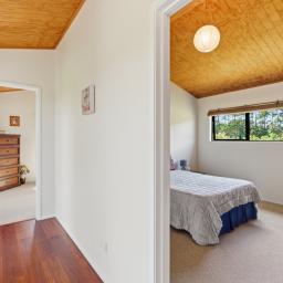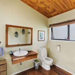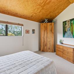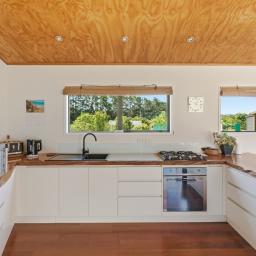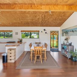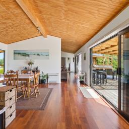 The nine year old home is built for the sun, with wide double glazed sliders opening onto a generous deck with covered areas for relaxing out of the sun. Polished kwila laminate floors in the living areas & natural wooden ceilings reflect the light throughout, making this home something very special.