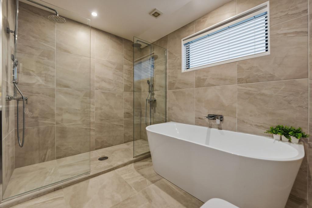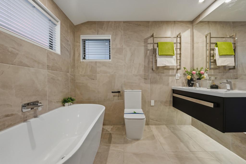 The fully fenced double glazed home features five bedrooms, four bathrooms, two living areas, and a double internal-access garage, with additional off-street parking and ample street parking for visitors.